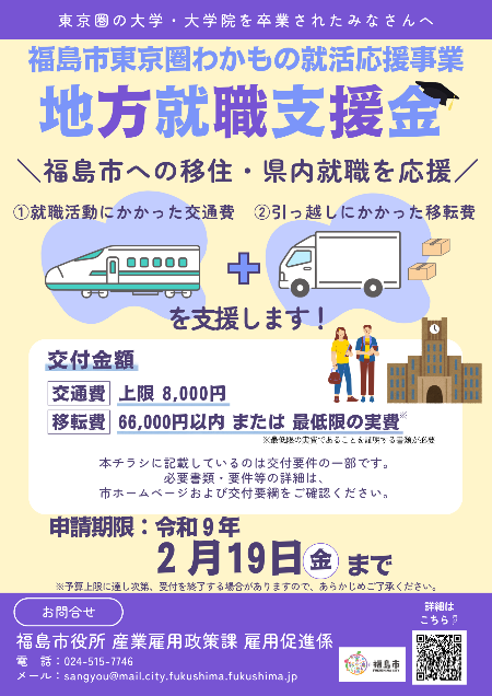詳細は「福島市東京圏わかもの就活応援事業における地方就職支援金交付要綱」をご確認ください。