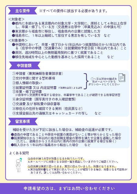 福島市への移住と福島県内の企業への就職を支援するため、東京圏内の対象大学等に通う学部生・院生について、