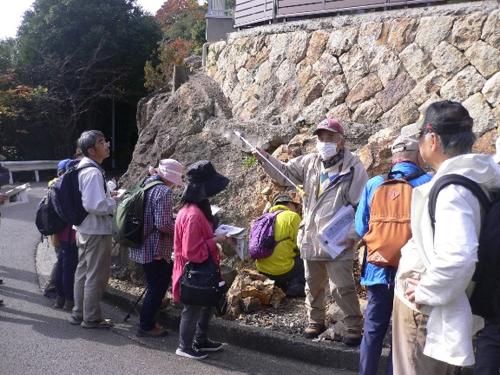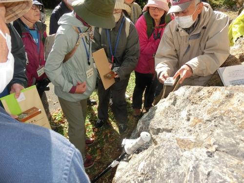 今回のフィールドワークは、「なぜ、平坦な福島盆地のなかに、信夫山があるのか」ということを、信夫山の岩肌や講師の方が準備した鉱物標本を手にし、また、複数個所で地層の走向やクリノメーターを使用して傾斜を計り、考えるものでした。