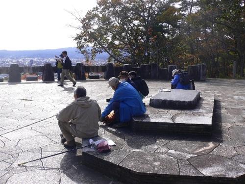 受講者の皆さんは、クリノメーターの使い方にてこずりながら、信夫山の生い立ちについて、探求していました。