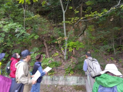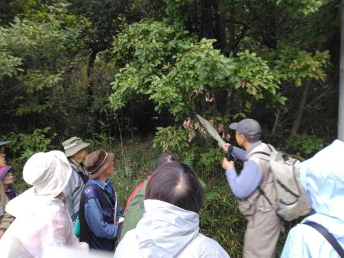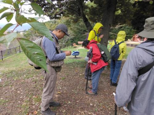 第二展望台で、黒沢先生から信夫山の植物の説明を受けています。