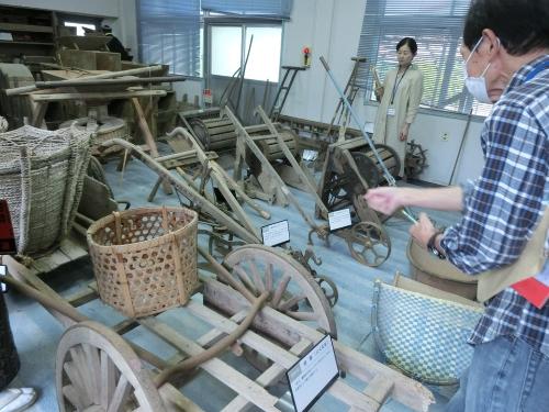 飯野民俗資料展示室において、農耕用具等の民俗資料を見学