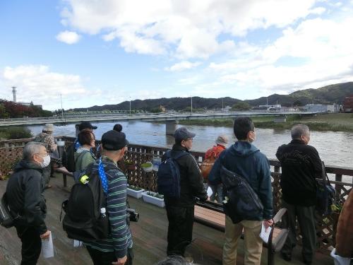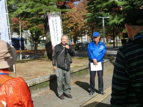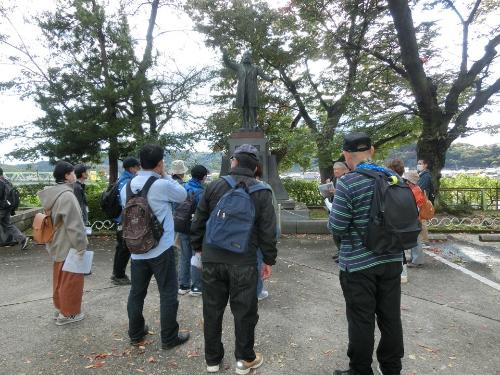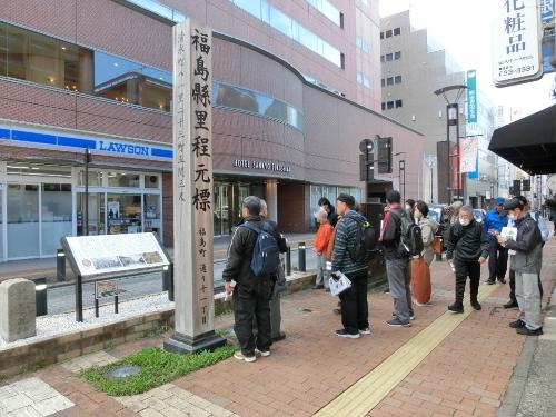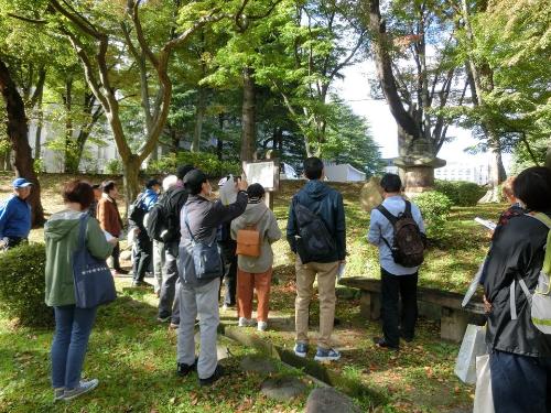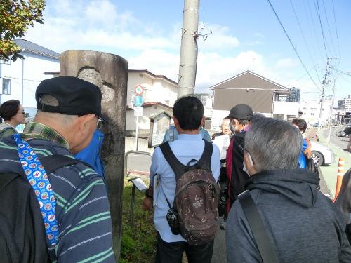 今回の歴史人材養成講座受講者の方々を対象としたフィールドワークは、10月25日(土曜日)に実施した一般市民の方々と同様のコースをめぐりました(大佛城阯碑~福島城土塁~福島河岸~寺町通り~旧奥州街道~福島城大手門など)。