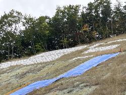 県の林地開発許可完了検査実施にあたり、県からの指摘を受け、発電事業者により三角形の切土面に対する追加の緑化工事が実施される。
