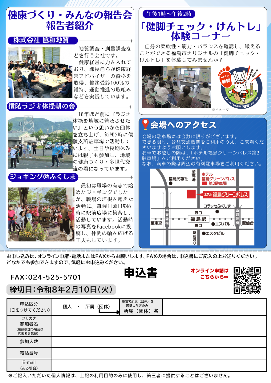 福島市内の企業・地域団体・若い世代の代表者が取り組む健康づくりについて報告します。