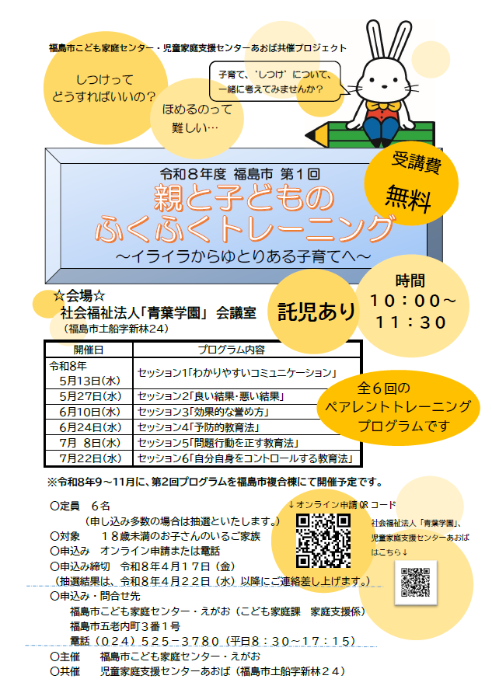 『親と子どものふくふくトレーニング』は、子どもの問題行動を減らし、望ましい行動を効果的にしつけられるスキルを学習するプログラムです。