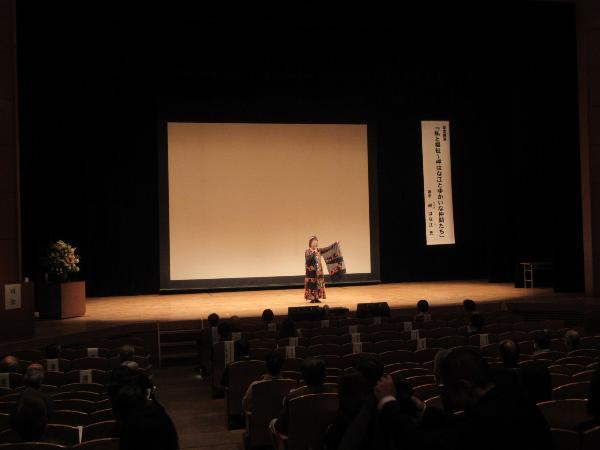 歌手の岬はな江(みさきはなえ)さんによる記念講演「私と福祉~岬はな江とゆかいな仲間たち~」が行われました。障がい者福祉に情熱を注ぐ日々と障がいを持つ子どもたちの純粋な心と触れ合う経験から「障がいは可能性」、障がい者も健常者も分け隔てなく触れ合うことの大切さを伝えていました。