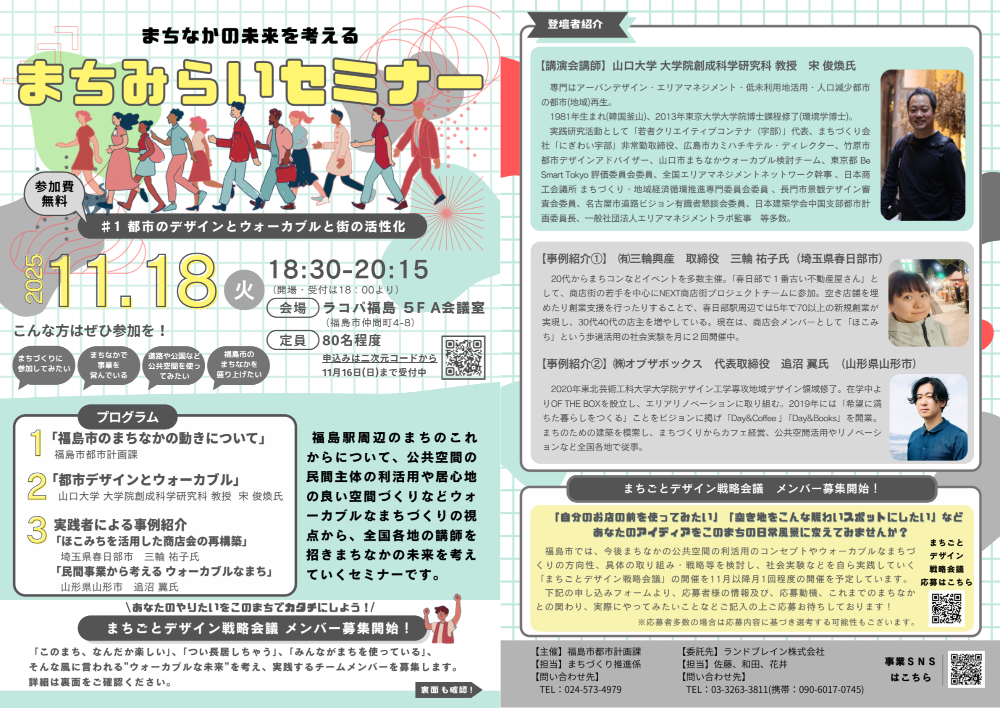 福島駅周辺のまちのこれからについて、公共空間の民間主体の利活用や居心地の良い空間づくりなどウォーカブルなまちづくりの視点から、全国各地の講師を招きまちなかの未来を考えていくセミナーを開催します。