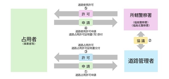 1. 占用者(事業者等)が道路管理者に道路占用許可申請