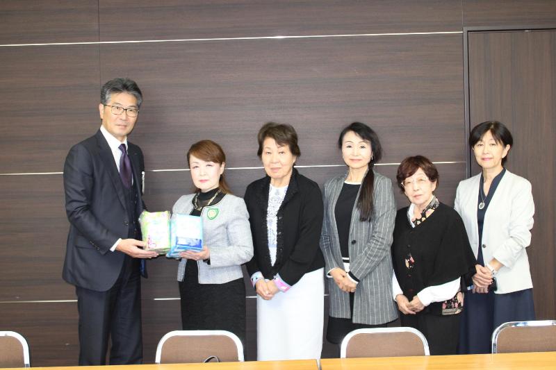令和7年10月28日(火曜日)に福島市役所8階教育長室にて、国際ソロプチミスト福島様より、生理用品260袋の寄贈がありました。「クローバープラン」活動の一環として、令和5年度より寄贈をいただいており、今回で8回目となります。これまでに寄贈いただいた生理用品は1900袋を超えます。