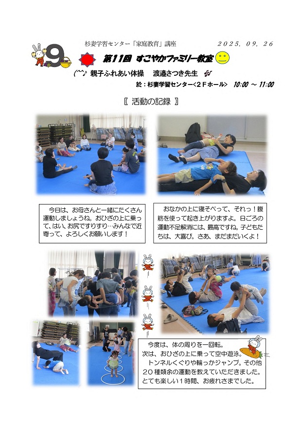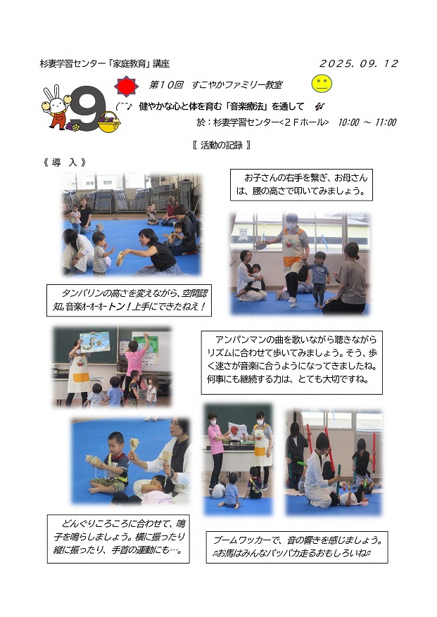 すこやかファミリー教室では、音楽療法やすこやか体操を通して、親子共に育つ楽しい子育てのあり方を学びます。