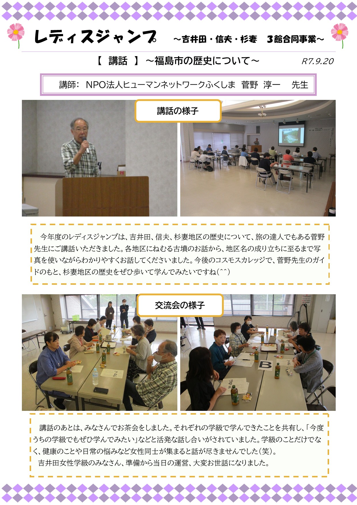 コスモスカレッジでは、各種講座(運動、モノ作り、座学など)を通し、よりよい女性像を求めて「いまを生きる」について学習します。