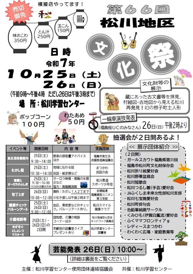 「松川地区文化祭」を開催します! 10月25日(土曜日)、10月26日(日曜日)に第66回松川地区文化祭を開催します! 多くのみなさんのご来館をお待ちしております♪ この記事に関するお問い合わせ先 学習センター 松川学習センター 福島市松川町字杉内33番地電話番号:024-567-2323ファックス:024-567-2403お問い合わせフォーム