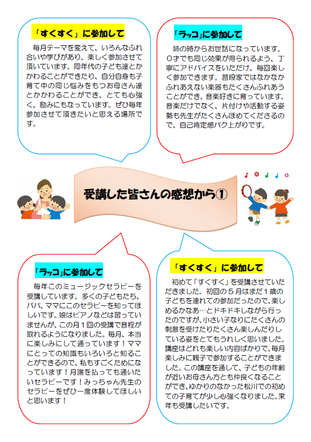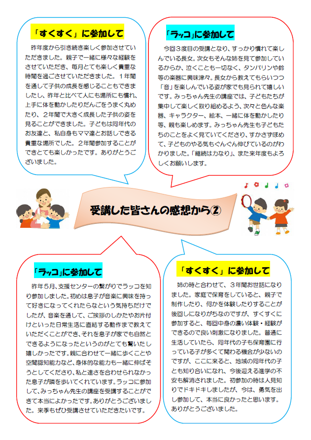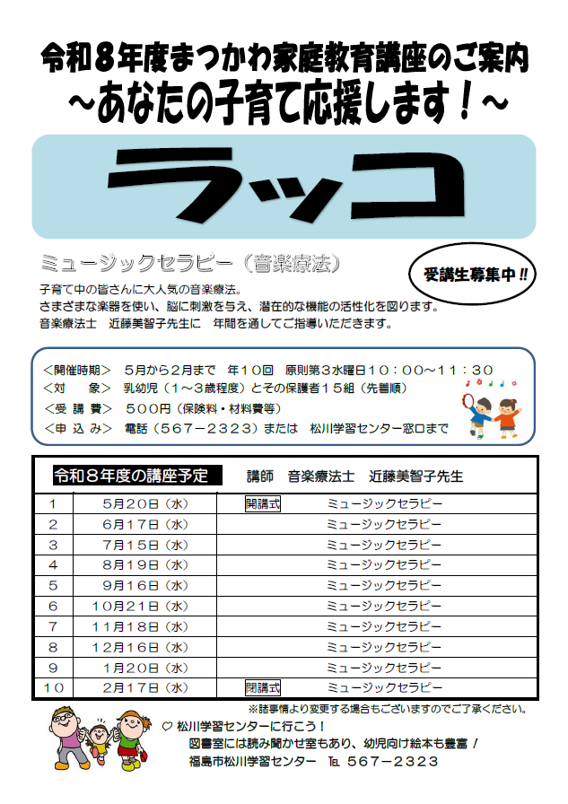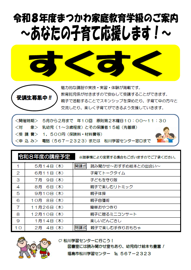 家庭教育学級「すくすく」 家庭教育学級「ラッコ」 受講者の感想 この記事に関するお問い合わせ先 学習センター 松川学習センター 福島市松川町字杉内33番地電話番号:024-567-2323ファックス:024-567-2403お問い合わせフォーム