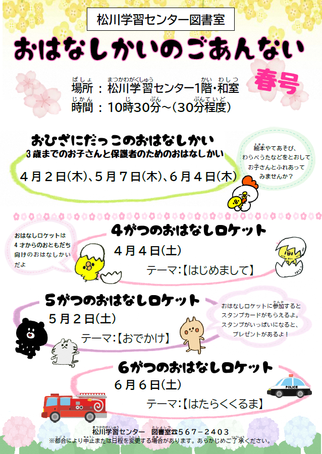 松川学習センター図書室では毎月2つのおはなしかいを開いています。 テーマに沿った本や季節に合わせた本など、楽しいおはなしや工作を用意していますので、ぜひ遊びに来てください♪ この記事に関するお問い合わせ先 学習センター 松川学習センター 福島市松川町字杉内33番地電話番号:024-567-2323ファックス:024-567-2403お問い合わせフォーム