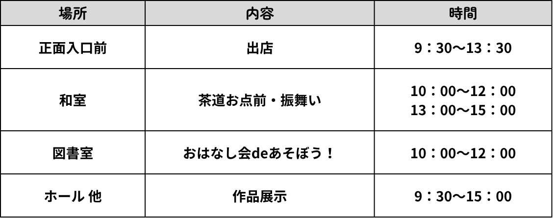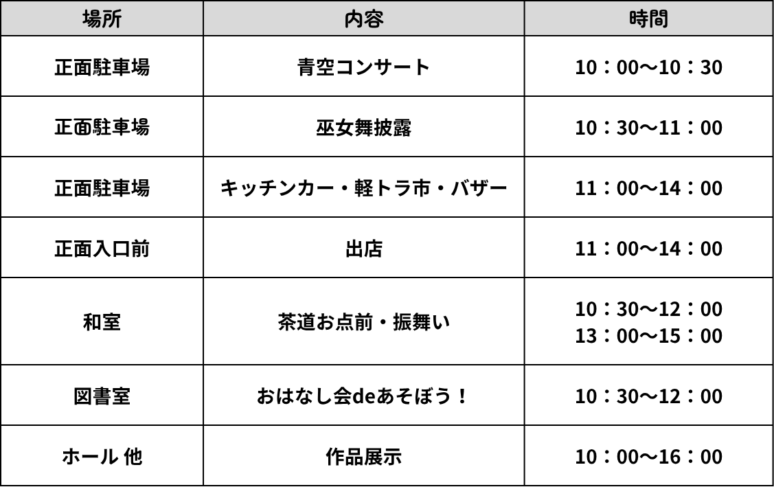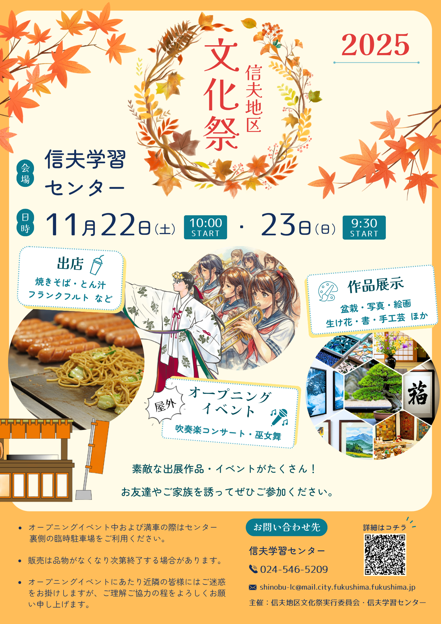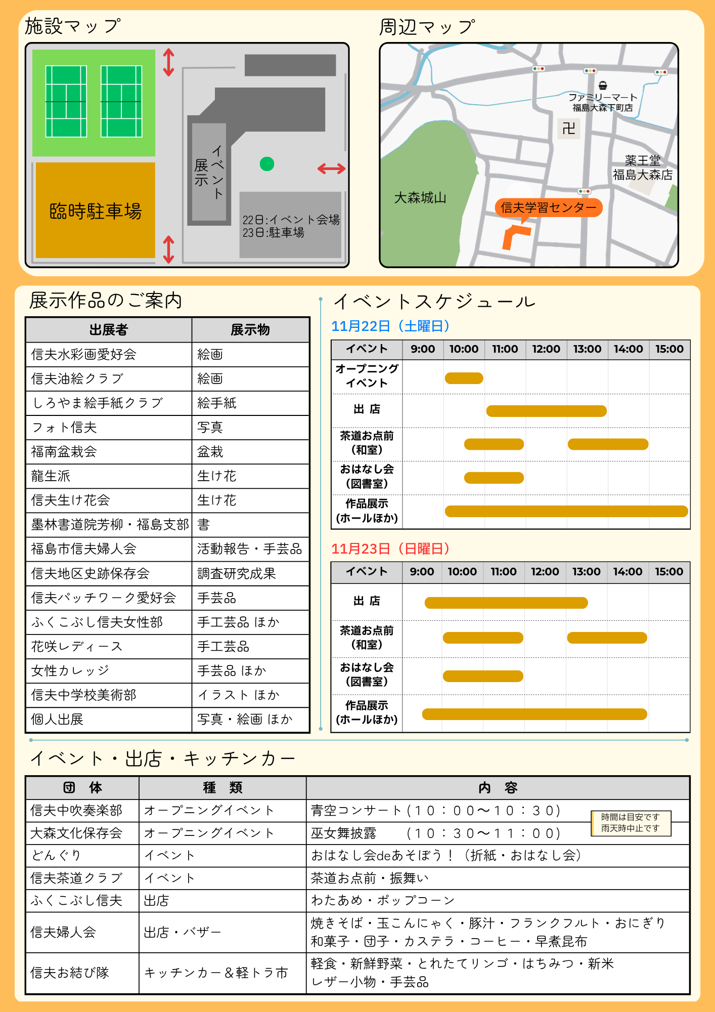 概要 日程 2025年11月22日(土曜日)午前10時から午後4時まで 2025年11月23日(日曜日)午前9時30分から午後3時まで イベント・出店(day1) イベント・出店(day2) 会場案内図 ※1 オープニングイベント中はご利用できません。 大きな地図を見る(GoogleMapページへ) この記事に関するお問い合わせ先 学習センター 信夫学習センター 福島市大森字馬場1番地電話番号:024-546-5207ファックス:024-546-5216お問い合わせフォーム
