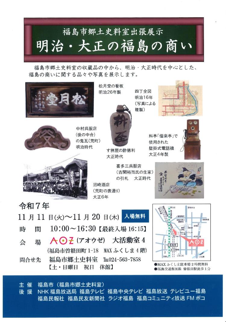 【内容】福島市郷土史料室の収蔵品の中から、明治・大正時代を中心とした、福島の商いに関する品々や写真を展示します。