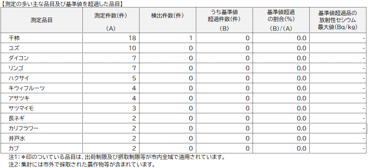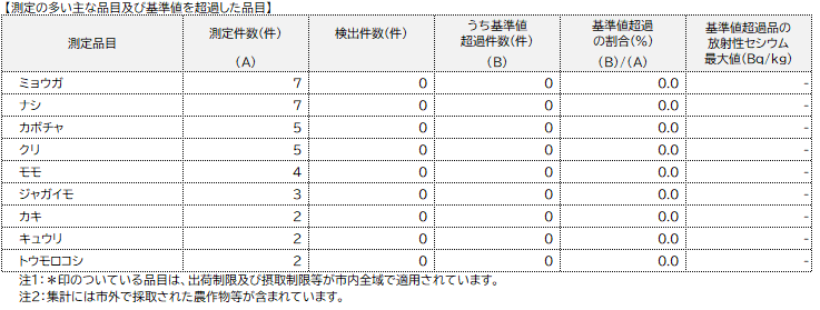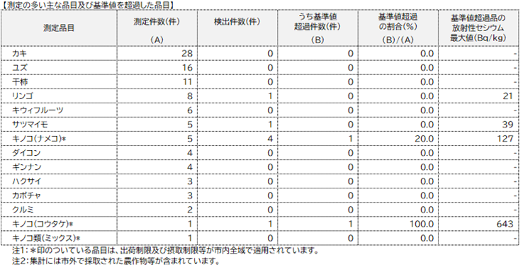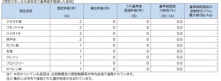 国の指示により出荷制限が適用されている品目は、基準値を超過する場合があります。不用意な放射性物質の摂取を避けるため、これらの品目については測定したうえでご利用ください。